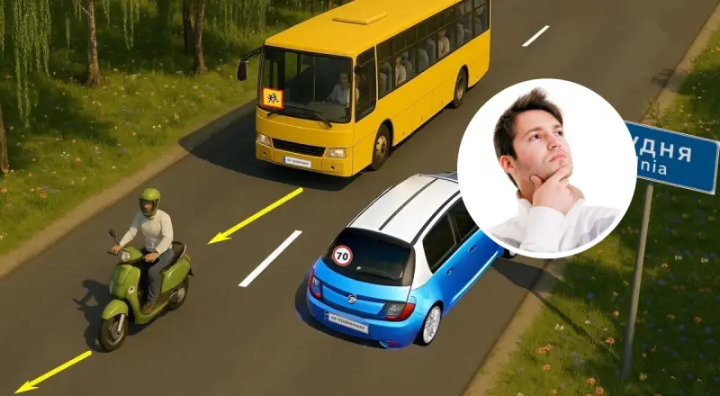 Тепер потрібно розібратись з мопедом та автобусом. В пункті 12.6 ПДР зазначається, що поза населеними пунктами на всіх дорогах та дорогах, що проходять через населені пункти, позначені знаком 5.51 дозволяється рух зі швидкістю: