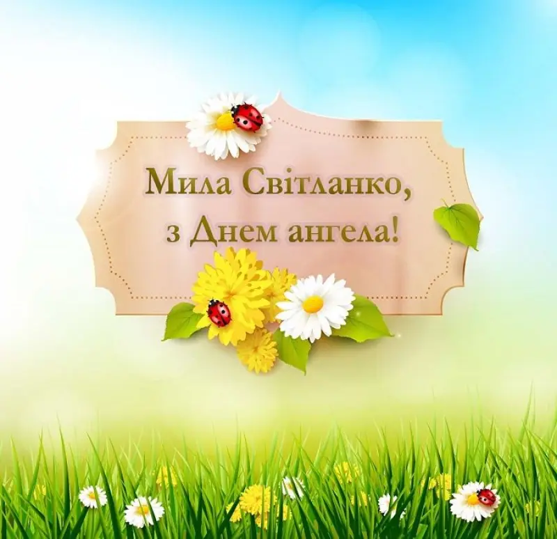 Світлано, у твій День ангела хочу побажати, щоб ангел-охоронець завжди тебе оберігав і допомагав тобі в усіх твоїх справах – домашніх і робочих, щоб усі твої починання були втілені в життя, щоб тебе завжди супроводжували удача, процвітання і успіх.