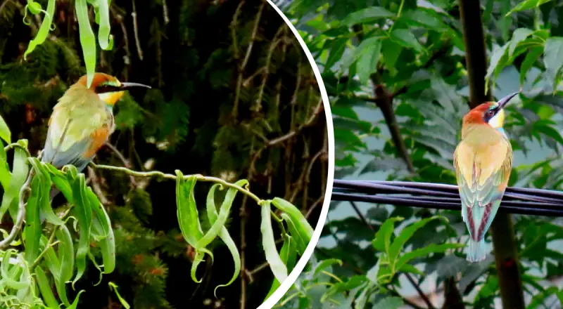 Мова йде про бджолоїдку звичайну (Merops apiaster) – одну з найефектніших пташиних видів України. Її оперення вражає поєднанням зеленого, жовтого, блакитного та рудого відтінків.