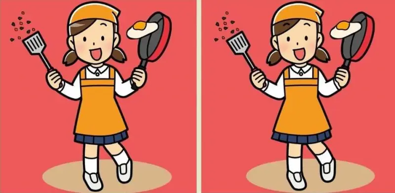 На обох малюнках зображена дівчинка, яка готує яєчню. І здається, вона потрапила у неприємності, адже смажене яйце от-от впаде на підлогу зі сковорідки.