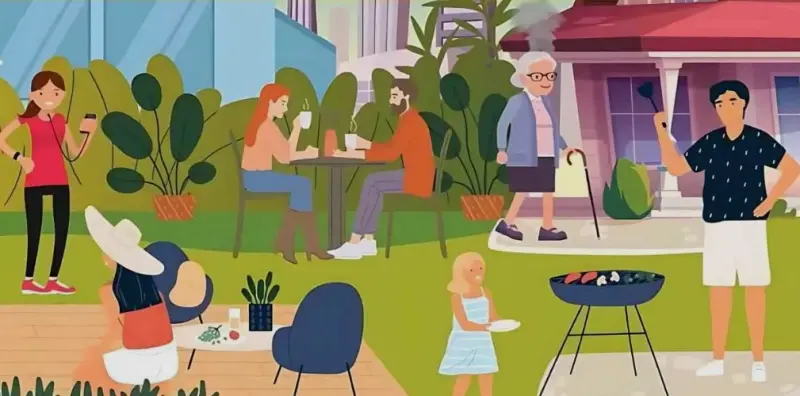 Погляньте на картинку нижче. Тут показана сцена вечірки на відкритому повітрі. Люди на картинці коротають час, відпочиваючи, спілкуючись і готуючи барбекю.
