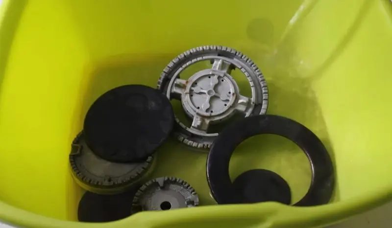 Потрібно взяти тазик і занурити туди конфорки разом із запчастинами. Додати 2 столові ложки лимонної кислоти і залити водою. Потрібно залишити конфорки у воді на деякий час.