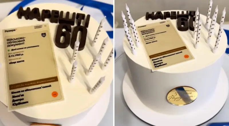 Торт призначався для 60-річного ювілею чоловіка. Кондитер прикрасила його свічками, скріншотом з додатку Резерв+, де прописана відстрочка до кінця життя, і написом "Нарешті 60".