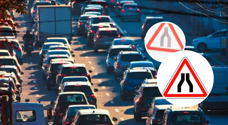 На іншому ж знаку можна побачити дві проїжджі частини, які з’єднуються в одну проїжджу частину, тому цей знак попереджає вас, що ви їдете до кінця дороги з подвійною смугою руху.