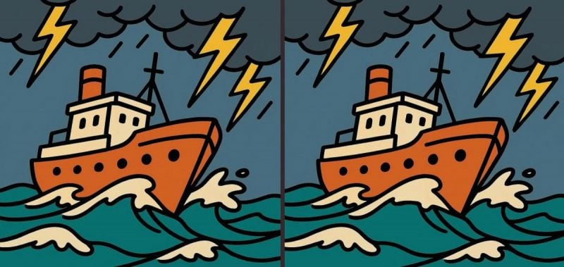 Отже, ви готові до наступного завдання? Уважно подивіться на два зображення корабля, що пливе крізь шторм. Картинки можуть здатися абсолютно однаковими, але не обманюйте себе. На вас чекають три приховані відмінності. Фішка в тому, що у вас є всього 65 секунд, щоб знайти їх усі. Спробуйте і перевірте свою гостроту зору!
