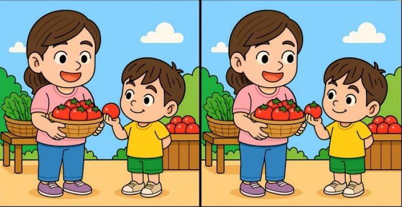 Отже, ви готові до наступного завдання? Уважно подивіться на два зображення, де мама і син збирають помідори. На перший погляд вони можуть здатися однаковими, але на них приховані 3 невеликі відмінності. Думаєте, зможете знайти їх всі за 45 секунд? Спробуйте і перевірте свою гостроту зору!
