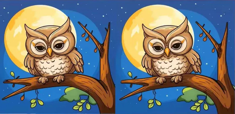 Перед вами два зображення сови на дереві. На перший погляд вони здаються повністю однаковими, але це не так — між ними заховані три ледь помітні відмінності.