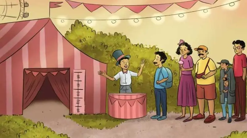 На картинці ми бачимо сцену карнавалу, де люди вишикувалися в чергу для перегляду магічного шоу. На перший погляд на знімку видно шість осіб. Однак є ще одна особа, прихована на виду.