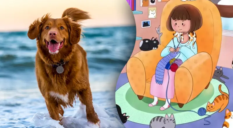 На малюнку ми бачимо кімнату, посеред якої на кріслі сидить дівчина. Вона щось в’яже. А тим часом навколо неї зібралося багато котів. Кожен з котиків займається своїми справами – хтось спить, а хтось грається. Але десь на картинці причаївся собака. Чи зможете ви його знайти?