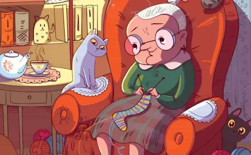Сьогоднішня головоломка з візуальними ілюзіями перевірить вашу гостроту зору. На зображенні зображена літня жінка, яка сидить на стільці і в'яже вовняну шкарпетку. Її оточують улюблені кішки. На картинці метелик захований поруч із кішками і літньою жінкою.