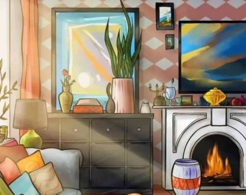 Уважно подивіться на зображення вище. На перший погляд, це - затишна, гарно оформлена вітальня, сповнена яскравими подушками, кімнатними рослинами, витворами мистецтва та домашнім декором.