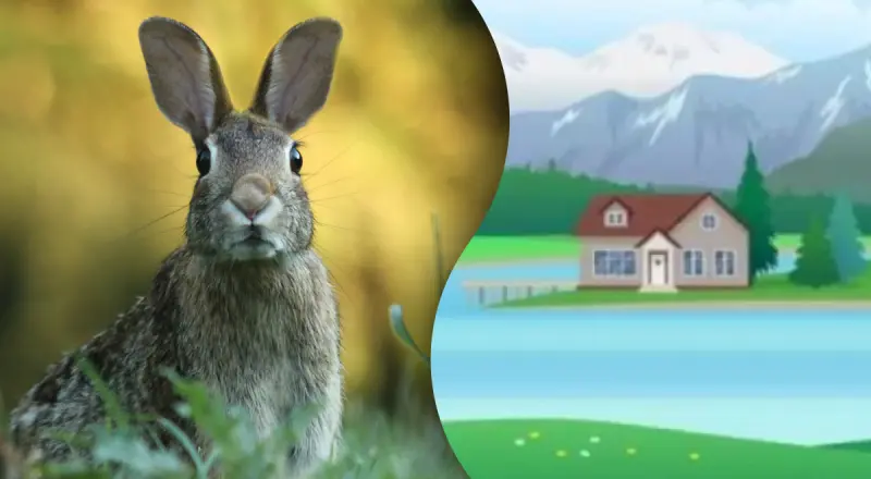 На картинці ми бачимо будинок біля озера, а трохи далі за будинком – гори. Також ми бачимо небо і хмари, невелику кількість дерев і траву. Але десь серед цієї природи є прихована тварина – кролик, помітити якого буде дуже нелегко.