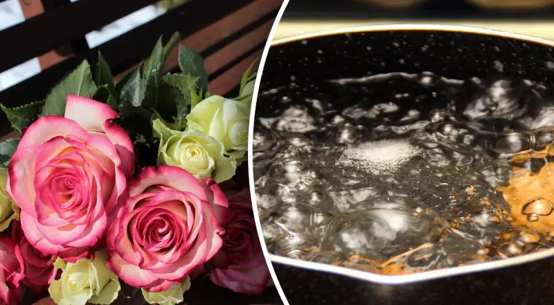 Для початку квіти потрібно переставити у посудину та залити їх кип'ятком на 2-3 сантиметри. Коли на дні з'являться бульбашки, квіти потрібно витягнути та обрізати ошпарене стебло.
