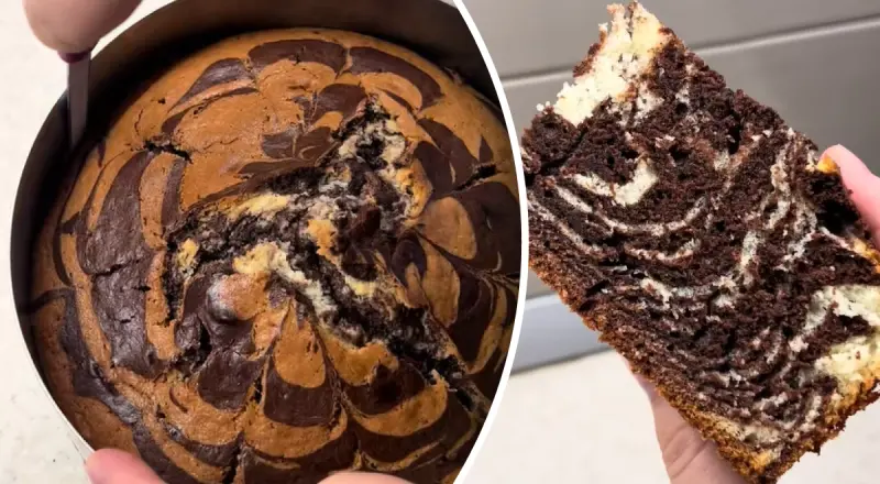 Наступним кроком треба розділити тісто на дві частини. В одну з них всипаємо какао. Після цього залишається підготувати форму і почергово викладати в неї по ложці кожного тіста. Вкінці на кексі можна зробити візерунок. "Зебру" випікаємо у розігрітій до 160 градусів духовці протягом 50-55 хвилин.