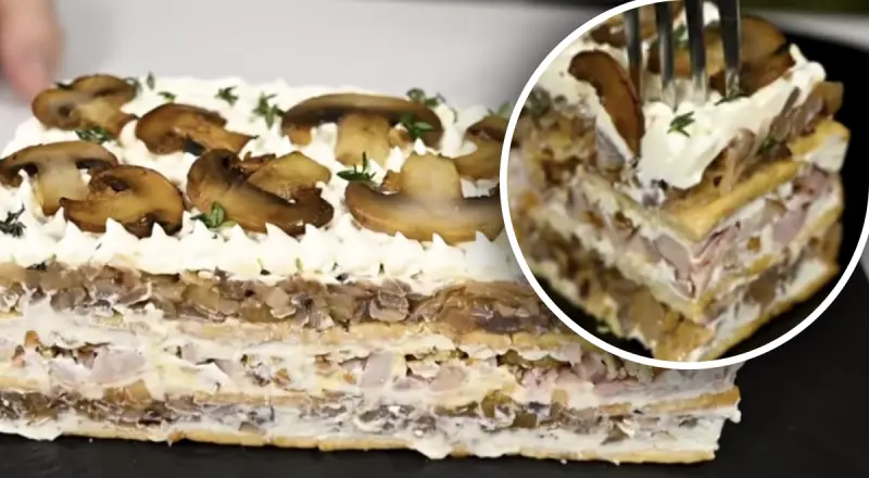 Що може бути смачніше вишуканого салату на святковому столі. Пропонуємо приготувати закусочний торт з грибами і курочкою.