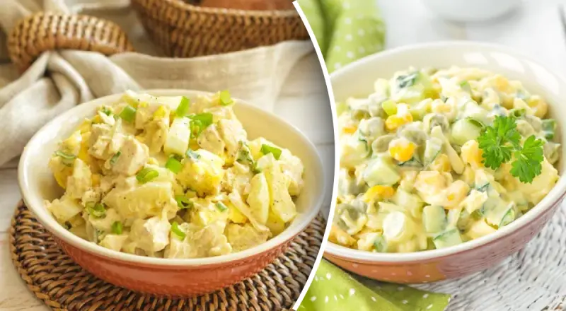 У глибокій мисці змішайте всі інгредієнти, заправте майонезом, посоліть і поперчіть.