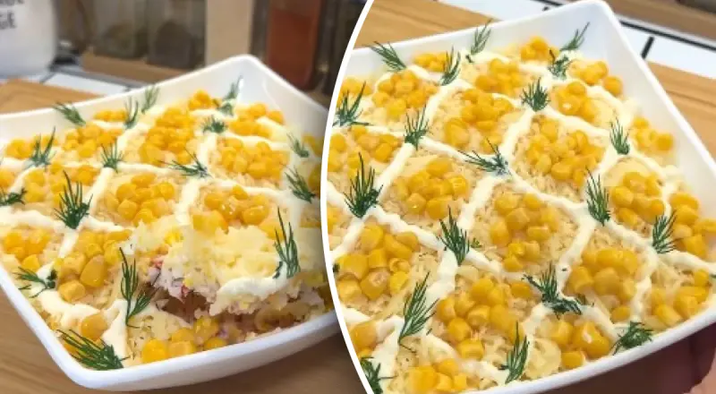 Прикрасьте салат кукурудзою та гілочками кропу і готово.