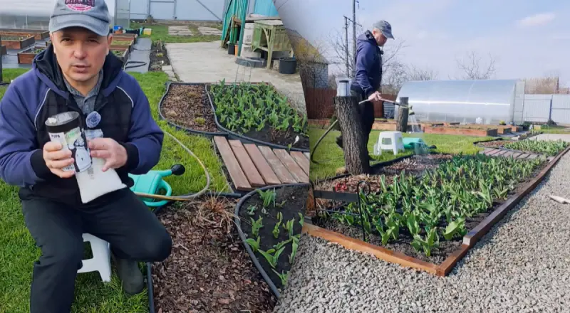 Ми не ризикуємо обпекти корінці на тюльпанах. Столова ложка (кожного компонента) — розчиняємо... 10 л розчину можна вилити на 2 м² — цього буде цілком достатньо.