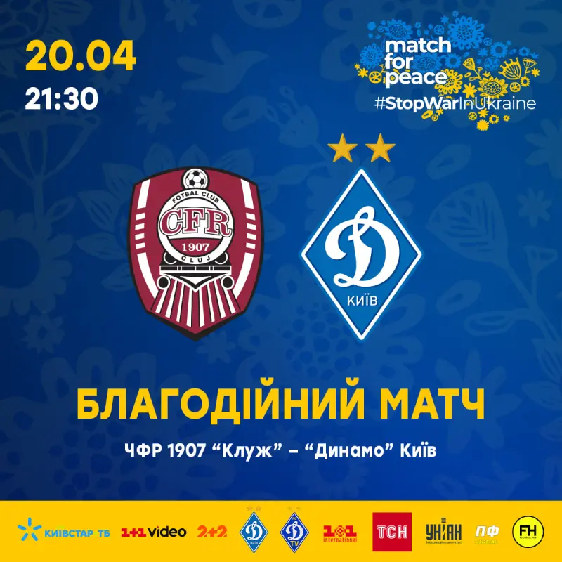 20 квітня о 21:30 (СЕТ, час співпадає з київським) на стадіоні Костянтина Редулеску (Stadionul Dr. Constantin Rădulescu) в румунському містечку Клуж-Напока пройде благодійний матч Match for peace #StopWarInUkraine між командами CFR 1907 Cluj та українським «Динамо». Транслюватиме подію румунський телеканал PRIMA TV та платформа Primaplay.ro, українські мовники 2+2, 1+1 International, Динамо Київ TV, М1, платформи онлайн-телебачення 1+1 Video, Київстар ТБ, Vodafone TV, YouTube-канали FootballHub, «Динамо», ТСН та УНІАН.