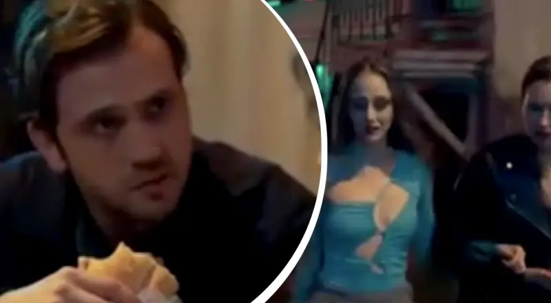 Головний герой, бачачи яскраво вдягнутих дівчат, які у вуличного торговця купують дві котлети, недбало кидає: "Україна".