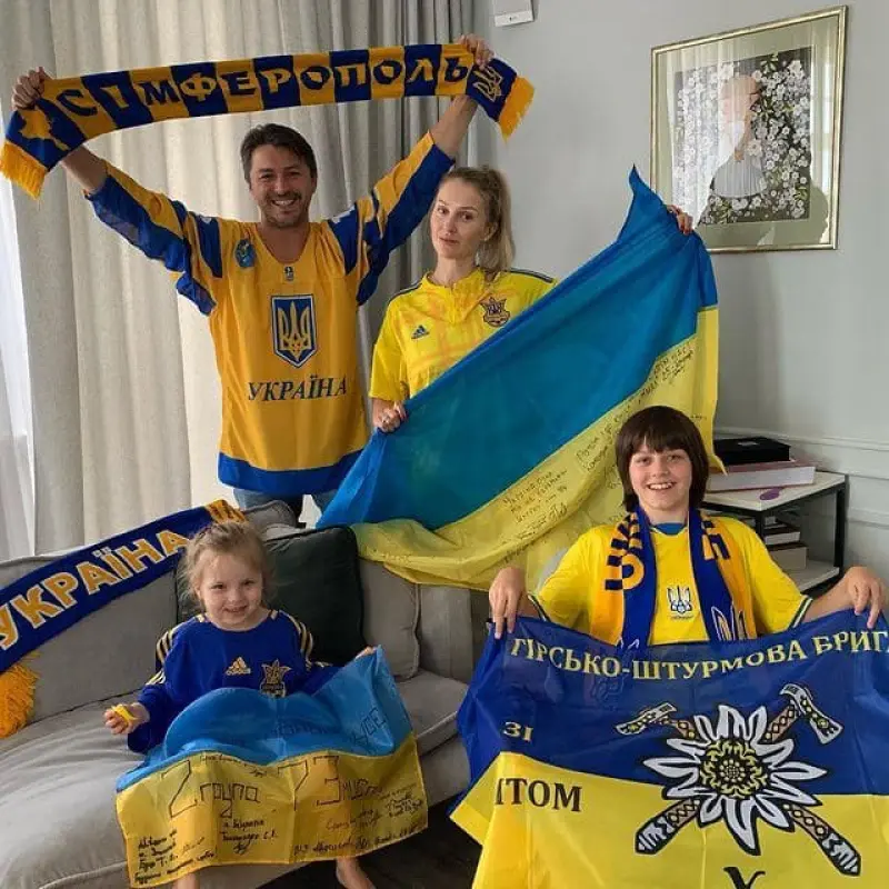 На знімку дружина і діти Притули одягнені у футболки національної збірної України з футболу. У кожного в руках-синьо-жовті стяги. А сам Сергій, вбраний в хокейну футболку української команди, в руках тримає шарфик із написом "Сімферополь".