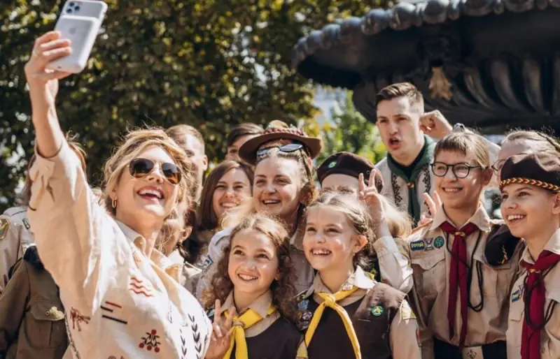 На знімках вона радісно спілкується з дітьми і старшими членами Пласту, і робить спільне селфі.