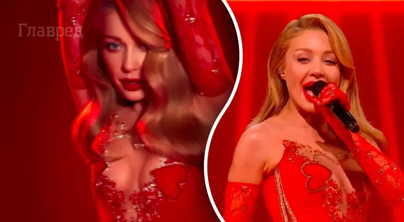 Зірка постала перед залом в яскравій червоній сукні з вирізами у формі серця і відвертим декольте. Виріб по всій довжині прикрашено розсипом страз. Пікантний образ доповнять мереживні рукавички і колготки з блискітками.