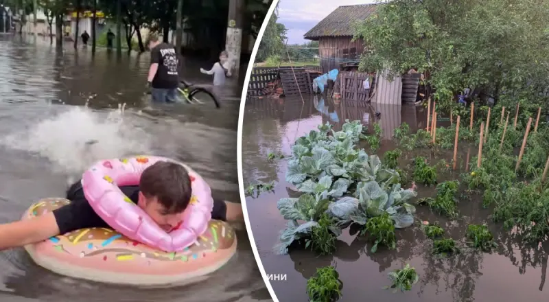 У Житомирі після потужної грози вулиці міста перетворились на річки, а місцеві жителі помітили, як риби плавають просто на дорогах. Мешканці міста навіть пересуваються на надувних матрацах і дитячих кругах.