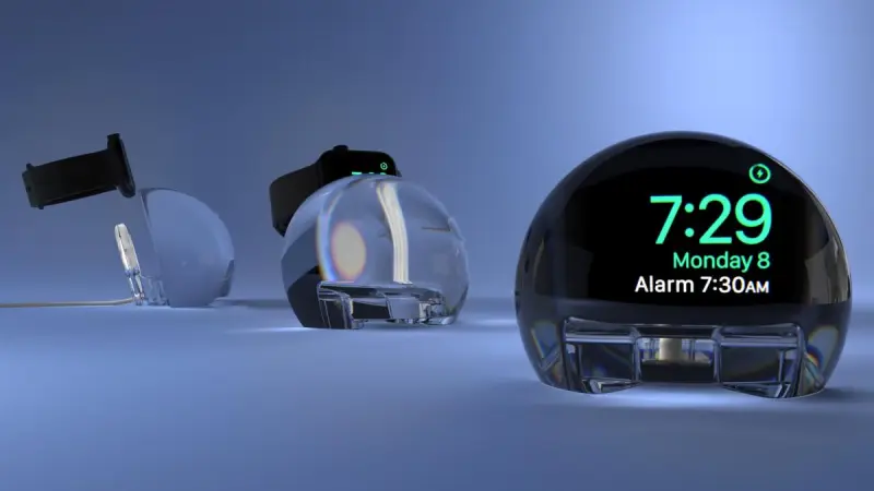 Стартап NightWatch придумав унікальний аксесуар, який в одну дію перетворює будь-яку модель Apple Watch в стильний настільний годинник. Док виконаний з оргскла і нагадує "магічну кулю".