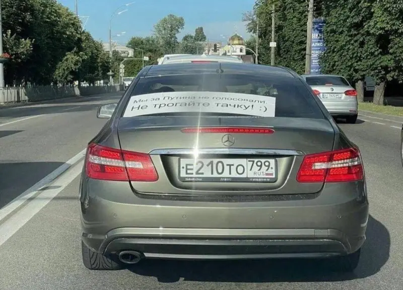 Крім того, на задньому склі автомобіля була величезна наклейка: "Ми за Путіна не голосували. Не чіпайте тачку".